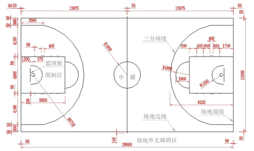 3、该圆弧的圆心要在对方球篮的中心垂直线与地面的交点上。圆心距端线内沿中点的距离为1.575米。