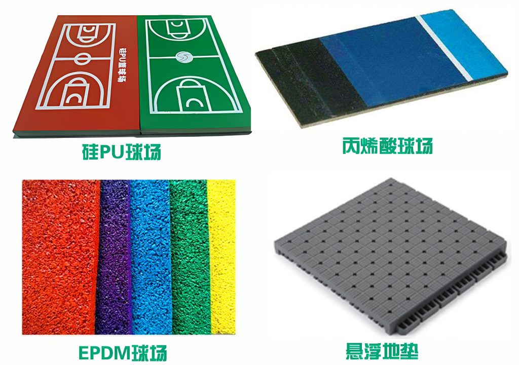 球场系列:硅PU球场、丙烯酸球场、室内PVC地板、悬浮地板、预制卷材等